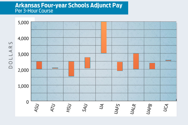Arkansas Business surveyed more than a dozen public colleges and universities across the state and found two-year schools typically pay adjuncts between $1,200 and $2,000 per three-hour course taught, while four-year schools generally pay between $2,000 and $2,500.