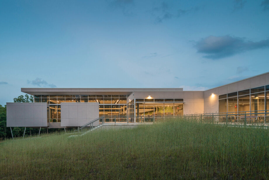 Taking advantage of the natural topography to string the public functions along a ridge, facilitating easy entry from parking into the building without stairs or ramps, the team capitalized on the steep terrain at the rear by projecting the reading room elevated on columns out into the woods, giving the impression that one is in a treehouse.