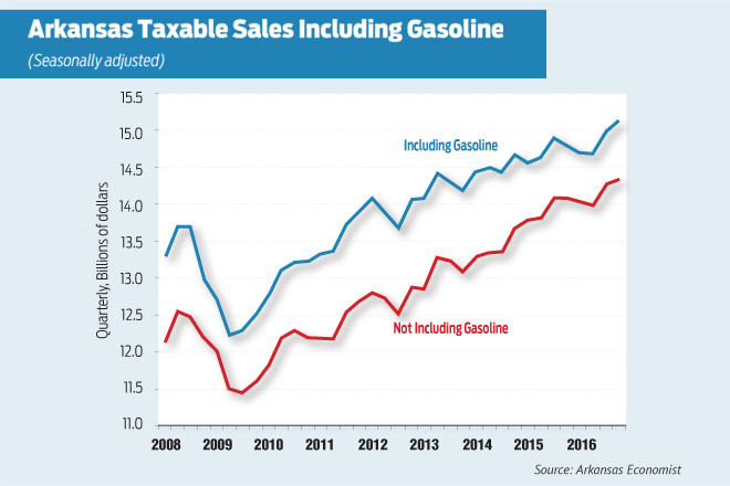 Both Arkansas taxable sales and Arkansas taxable sales including gasoline “declined during the first half of 2016, but recovered lost ground in the third and fourth quarters,” Pakko said on his Arkansas Economist blog. “On average, 2016 was a year of slowing growth in taxable sales.”