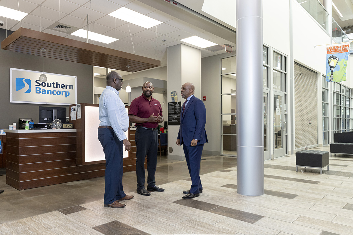 Darrin Williams (right), CEO of Southern Bancorp Inc., visits with staff members (from left) Derrick D. Jackson, branch manager, and Seun Aiyese, head of retail at Southern’s branch on 12th Street in Little Rock. (Karen E. Segrave)
