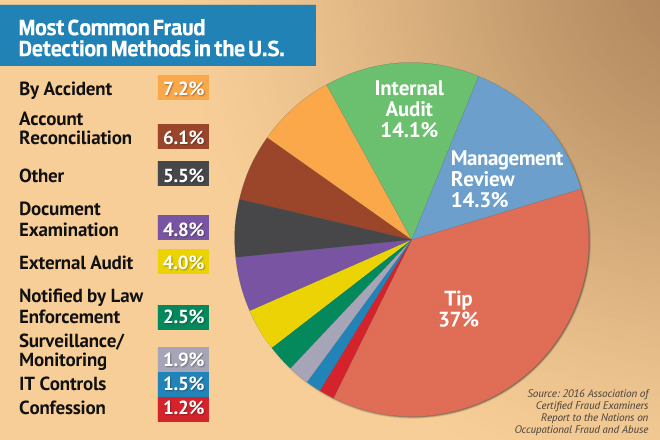 Around the world, tips are the most common way fraud is initially detected. That’s especially true in larger organizations (those with at least 100 employees). In the U.S., 37 percent of fraud is initially detected based on a tip, and about half of all those tips come from other employees. For organizations that have a hotline on which employees can leave tips, the share of frauds detected that way rises to more than 47 percent.