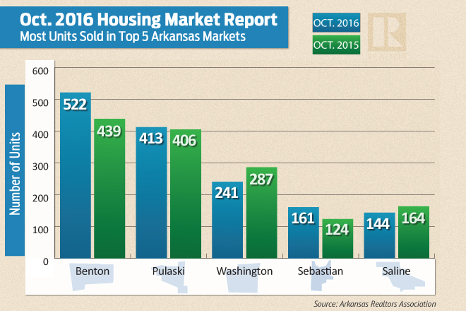 Of the top five counties selling the most homes, Sebastian County saw the biggest increase in activity, with 161 homes sold in October, up nearly 30 percent from the same month last year.