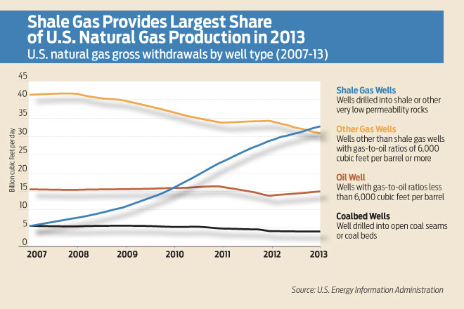 Withdrawals from shale gas wells rose from 5 billion cubic feet per day in 2007 to 33 Bcf per day last year. This accounted for 40 percent of total natural gas production and exceeded the production from nonshale natural gas wells.