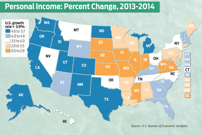 Personal income is the sum of net earnings by place of residence, property income and personal current transfer receipts. Its growth ranged from 0.5 percent in Nebraska to 5.7 percent in Alaska and Oregon, with 45 states growing faster in 2014 than in 2013.