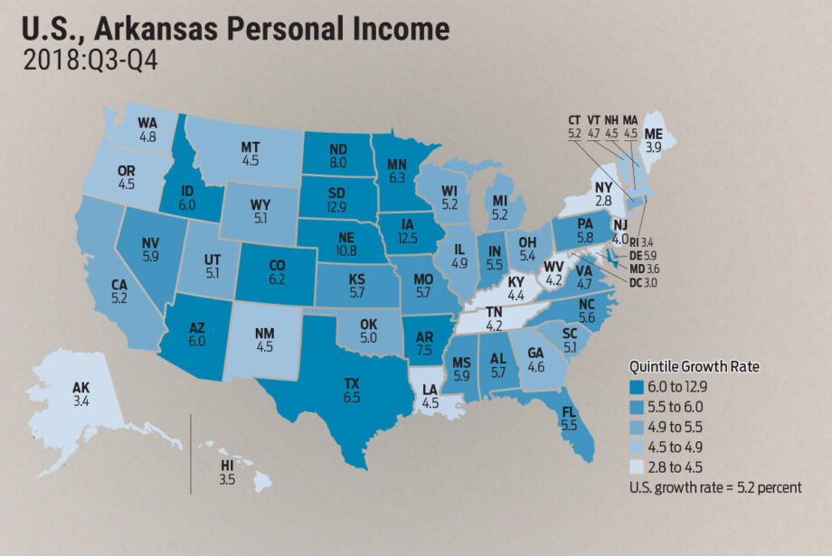 Total personal income in Arkansas jumped at an annual rate of 7.5% in the fourth quarter of 2018, outpacing the U.S. growth rate of 5.2%, according to the U.S. Bureau of Economic Analysis. That pace made Arkansas the fifth fastest-growing state in the nation.