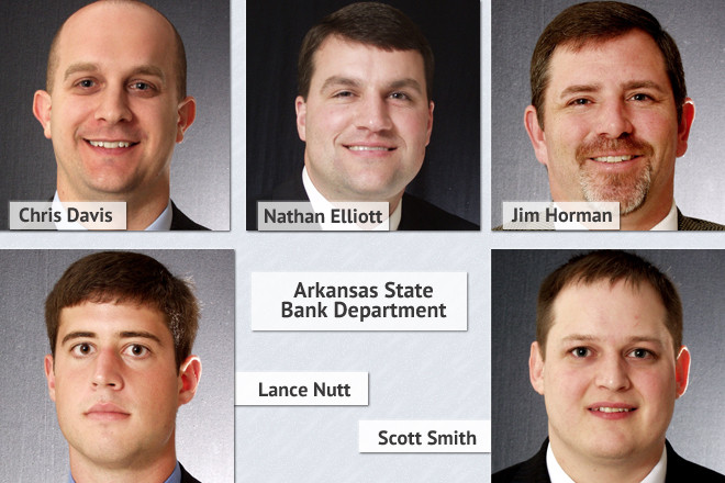 Chris Davis, Nathan Elliott, Jim Homan, Lance Nutt and Scott Smith have been promoted to certified bank senior examiner by the Arkansas State Bank Department.