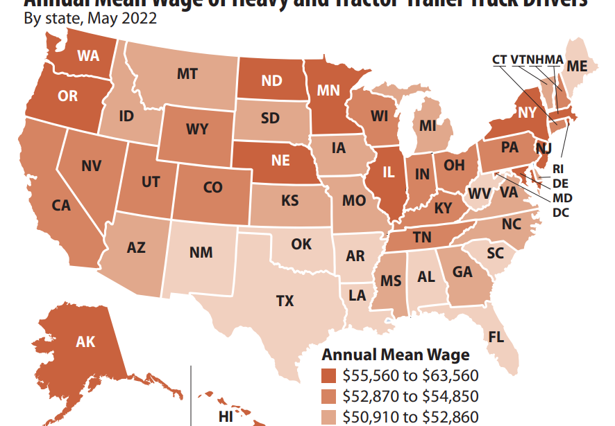 The average annual wage for drivers of heavy and tractor-trailer trucks was $47,090 in Arkansas in 2022, compared with $53,090 nationwide, according to the U.S. Bureau of Labor Statistics.