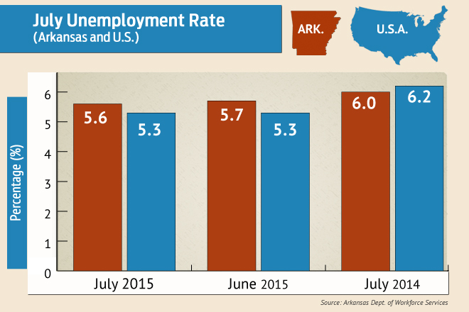 The statistics, released Friday by the Arkansas Department of Workforce Services, indicate that Arkansas’ civilian labor force declined 300, a result of 1,300 fewer unemployed and 1,000 more employed Arkansans. The United States’ jobless rate remained stable at 5.3 percent in July.