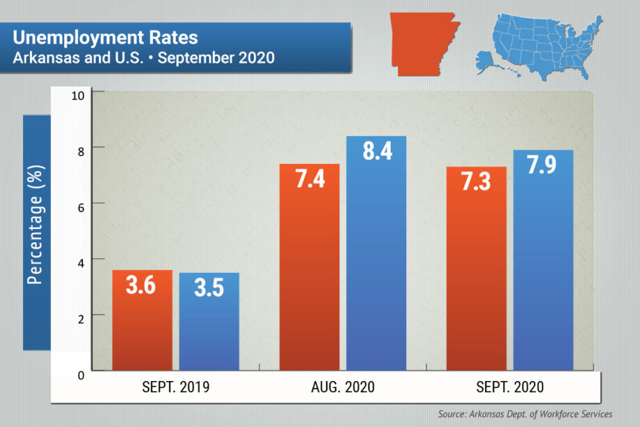 Arkansas’ seasonally adjusted unemployment rate declined to 7.3% in September from 7.4% in August, the state Department of Workforce Services reported Tuesday.