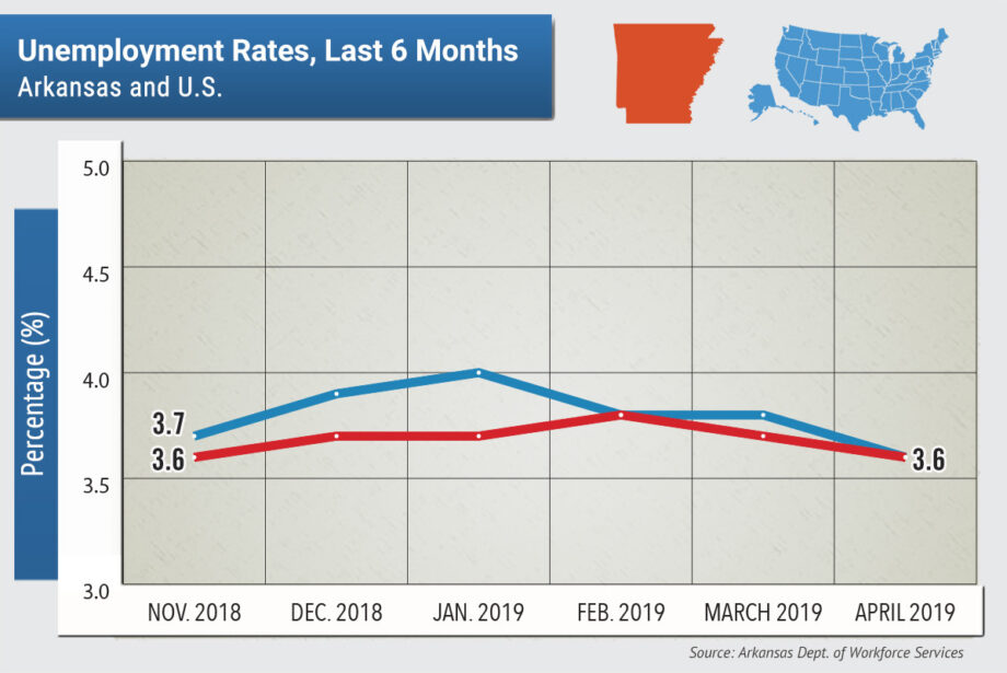 Arkansas’ unemployment rate in April was 3.6%, down one-tenth of a percentage point from the previous month.