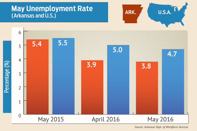 Arkansas’ seasonally adjusted unemployment rate hit a new low, 3.8 percent for May, a decrease of 1.6 percent since May 2015.
