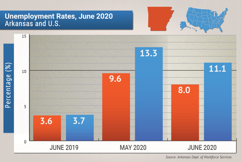 Arkansas’ seasonally adjusted unemployment rate declined to 8% in June from 9.6% in May, the state Department of Workforce Services reported Friday.