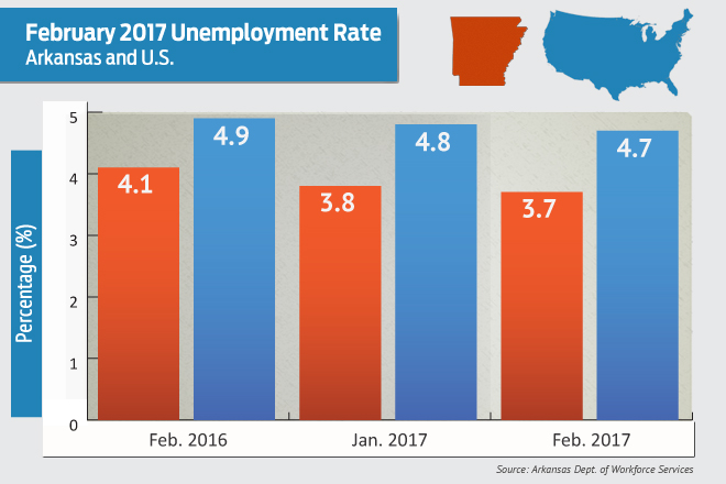 Arkansas’ unemployment rate continued to fall in February to the lowest on record, 3.7 percent. The rate was 3.8 percent in January and 4.1 percent in February 2016.