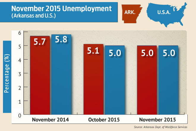 “Arkansas’ unemployment rate declined to 5.0 percent in November, down seven-tenths of a percentage point since November 2014,” BLS Program Operations Manager Susan Price said in a news release. “The last time Arkansas’ rate was at 5 percent was in April 2008.”