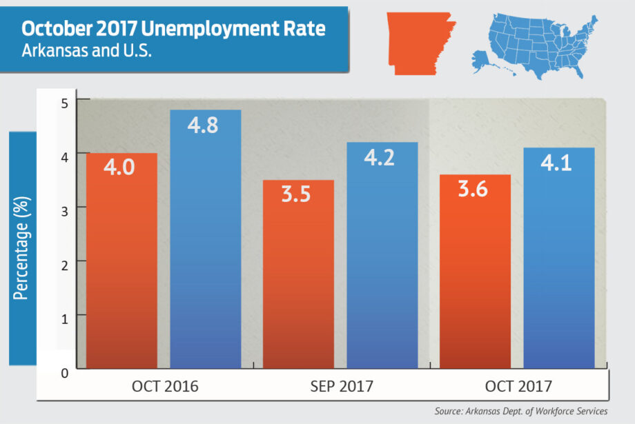 Arkansas’ unemployment rate in October rose to 3.6 percent from 3.5 percent in September, but it was still lower than the 4 percent reported for October 2016.