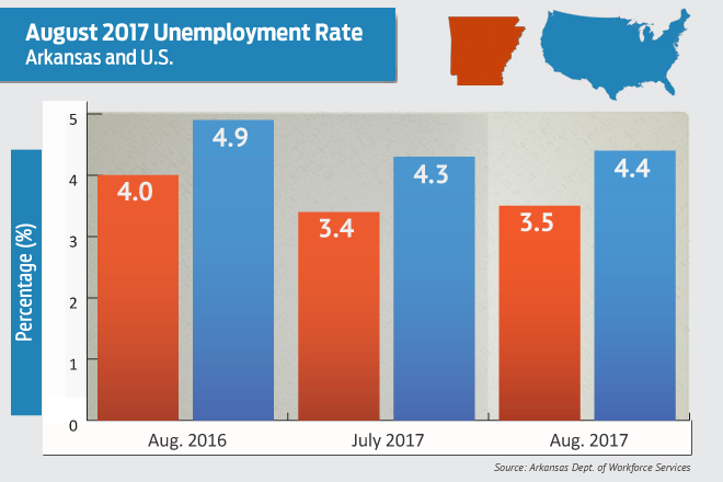The state Department of Workforce Services said Arkansas’ civilian labor force rose by 3,272, the result of 2,038 more employed, but with 1,234 more Arkansans unemployed. In August, the U.S. jobless rate stood at 4.4 percent, up one-tenth of a percentage point from July but down five-tenths of a percentage point from August 2016.