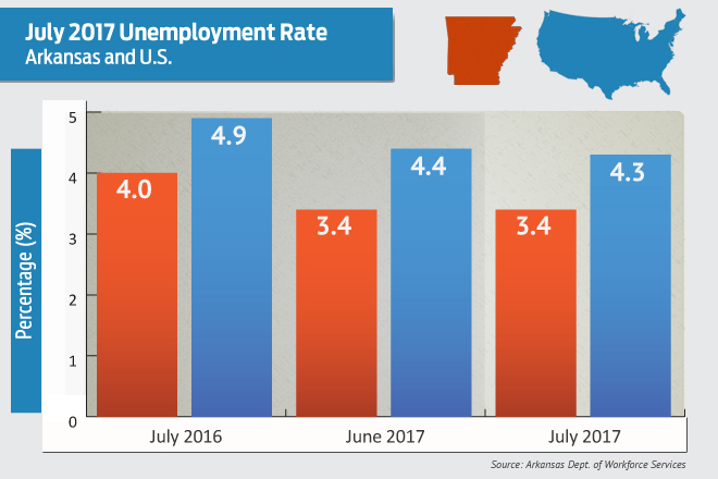 The state Department of Workforce Services said Arkansas’ civilian labor force rose by 9,168, the result of 9,058 more employed, but with 110 more Arkansans unemployed. In July, the U.S. jobless rate stood at 4.3 percent, down one-tenth of a percentage point from June and down six-tenths of a percentage point from July 2016.