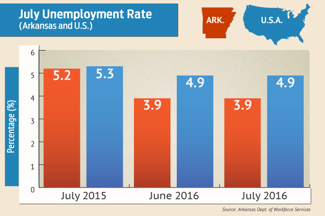 “Arkansas’ jobless rate remained stable between June and July, mirroring the trend seen at the national level,” Bureau of Labor Statistics Program Operations Manager Susan Price said. “Compared to July 2015, the unemployment rate is down one and three-tenths of a percentage point.”