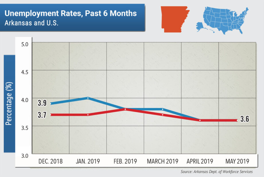 Arkansas’ unemployment rate in May, at 3.6%, was unchanged from the previous month.