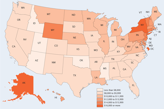 The 50 states and the District of Columbia spent $10,560 per student in 2011, a decrease of 0.4 percent compared with 2010. New York spent the most per pupil at $19,076. Arkansas spent $9,353 per elementary and secondary student in 2011.