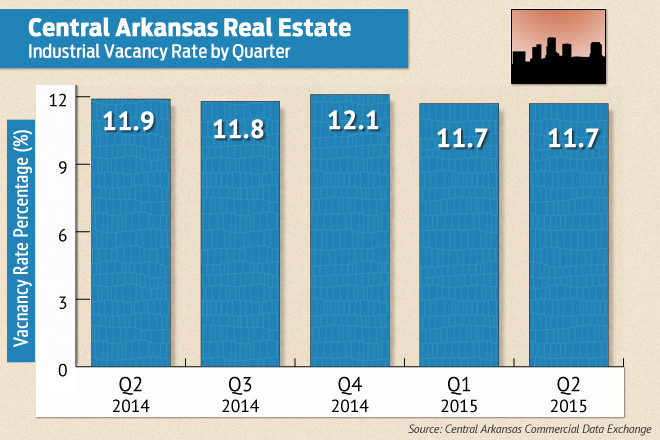 The vacancy rate for industrial space in central Arkansas fell slightly in the second quarter compared with the year-ago quarter, to 11.7 percent compared with 11.9 percent in second-quarter 2014.