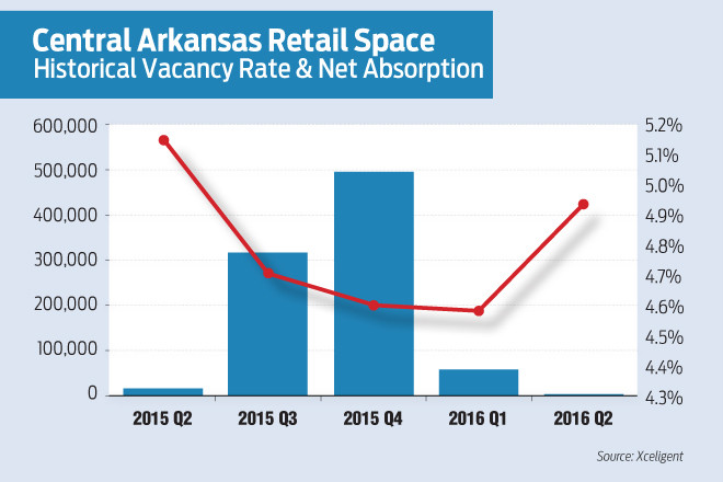 The vacancy rate for retail space in central Arkansas rose slightly in the second quarter, inching up to 4.9 percent compared with 4.7 percent in the first quarter.