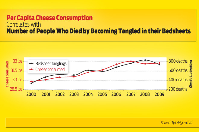 A Harvard law student named Tyler Vigen has a blog called Spurious Correlations in which he posts line graphs that seem to suggest a correlation between things that have no logical correlation. Like how cheese consumption correlates with deaths due to entanglement in bedsheets or how non-commercial space launches correlate with the number of doctorates in sociology that are awarded.