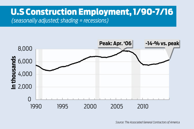 • Construction employment in Arkansas in July 2016 totaled 49,800, an increase of 0.8 percent compared with July 2015 and a 14 percent decrease from Arkansas’ peak in March 2007.
