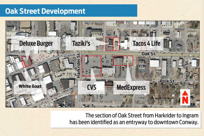 Conway’s downtown has traditionally ended where Oak Street intersects with bustling Harkrider Street, but city planners and commercial developers are attempting to push that historic envelope further to the east.