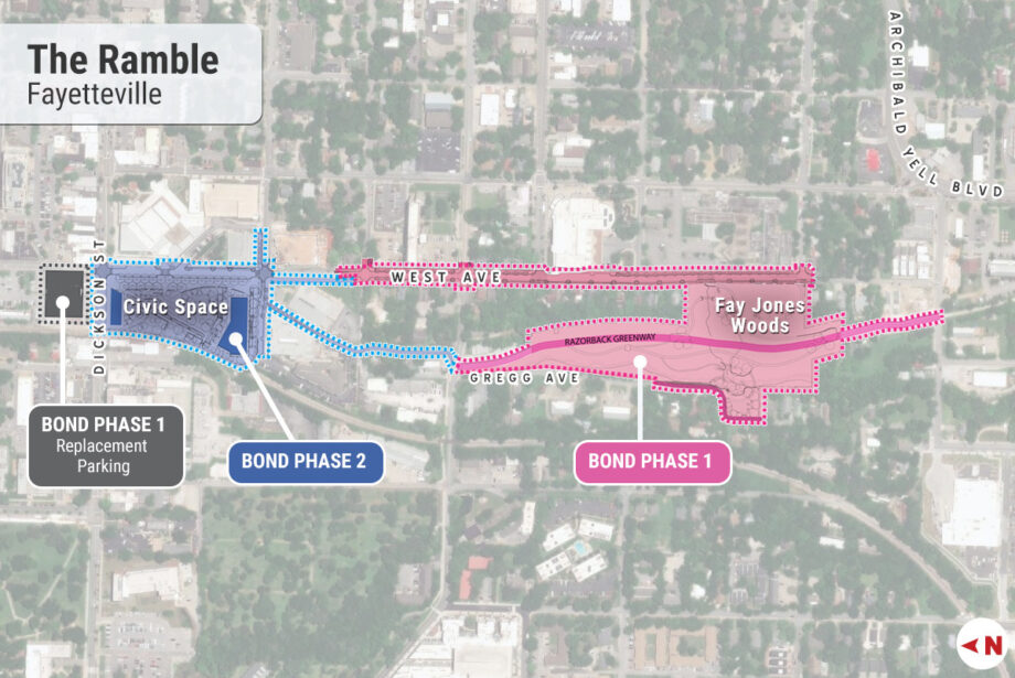 In October 2019, Fayetteville voters approved a $226 million bond proposal, of which $31.7 million was designated for the development of the Cultural Arts Corridor along West Avenue in downtown Fayetteville. The project has since been renamed The Ramble, and its first phase, the renovation and improvement of the Fay Jones Woods and Razorback Greenway, is scheduled to be finished in May.