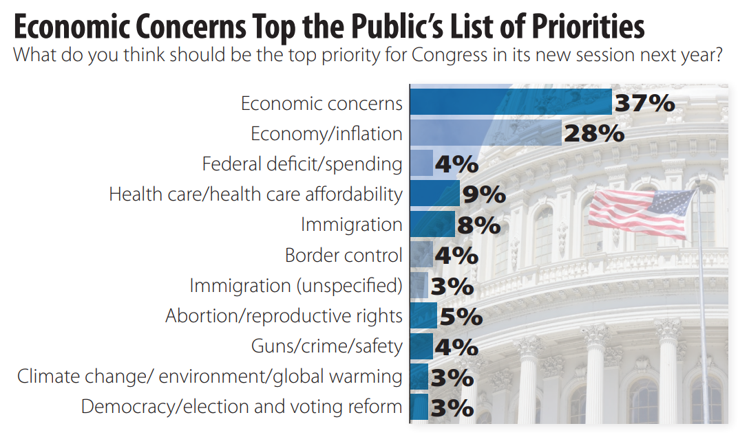 “More than one in three (37%) adults cite economic concerns when asked in their own words what should be the top priority for Congress in its new session next year, including 28% who mention inflation specifically,” KFF noted.
