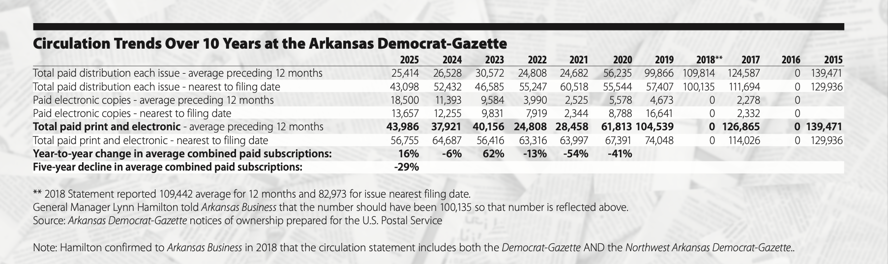 “Sunday is swollen by people who still pay to get print and don’t care that digital is included whether they want it or not,” longtime Arkansas Gazette and Arkansas Times editor and columnist Max Brantley said. “Paid electronic average is up to 18,500 [in 2025] versus 11,393” in 2024.