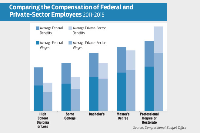 Federal civilian workers earned, on average, 17 percent more in total compensation — wages and benefits — than their counterparts in the private sector during 2011-15, according to the Congressional Budget Office.