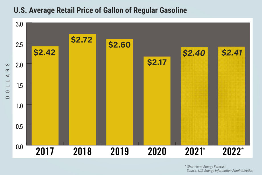 Gasoline prices are expected to rise from a 2020 average of $2.18 per gallon nationwide to $2.40 this year and $2.42 in 2022. Diesel prices, which averaged $2.55 per gallon in 2020, down from $3.06 in 2019, are expected to average $2.71 per gallon this year and $2.74 the year after.