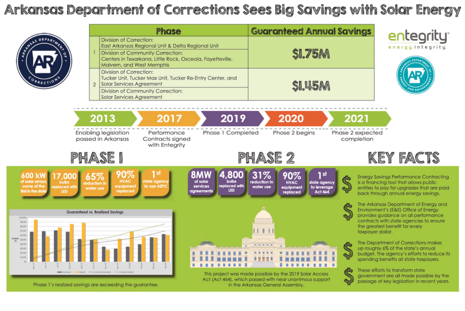 After beating its own guarantees for cost savings under a 2017 project of solar generation, LED lighting, HVAC upgrades, composting and water conservation, Entegrity will extend those conversions to other prison facilities and build two more solar farms, pending approval by the Arkansas Public Service Commission. After the second phase, the state expects its savings to top $3.2 million a year.
