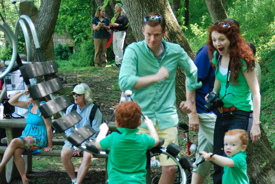 The Eureka Springs Interactive Music Park converted a city park into an experience using four unique instruments made of local woods and recycled materials. The chime arbor knows as GPAC plays the refrain from “Give Peace a Chance.”