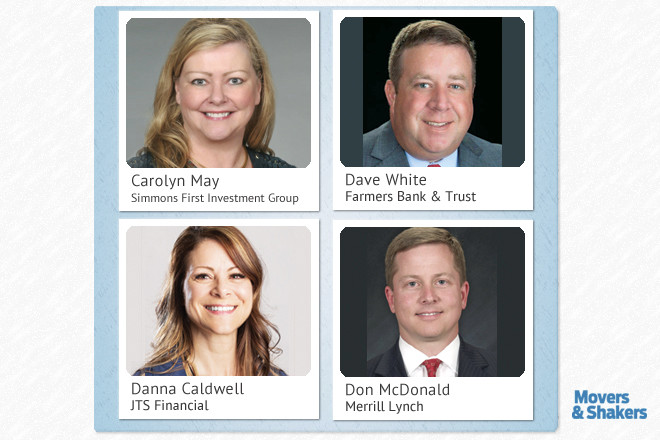 Carolyn May has joined Simmons First Investment Group in Little Rock and Ken Adams, David Seay, Joe France, Reed Willett and Angela Johnson have been promoted. May will serve as senior vice president and manager of investment financial operations. Adams and Seay have been promoted to senior vice presidents and will serve as investment securities registered representatives. France, an investment securities registered representative, and Willett, an investment trader, have been promoted to vice presidents, and Johnson, manager of fixed income and dealer bank operations, has been promoted to assistant vice president.