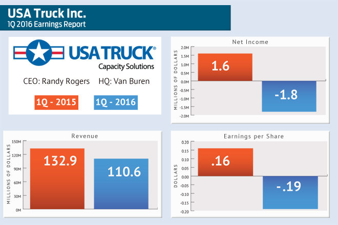 USA Truck Inc. of Van Buren on Thursday reported a first-quarter loss of $1.8 million, a decrease from the $1.6 million profit it reported in the same quarter of 2015.