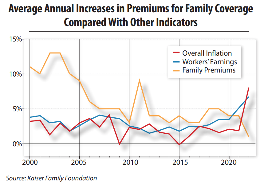 As the chart shows, premiums rose only 1% this year. “The modest change in premiums this year is unusual in that it is less than the increase in inflation (8%) or workers’ wages (6.7%) during the same period,” the survey said. “Even with this year’s minimal change, average premiums for family coverage have risen 43% since 2012, more than the shift in inflation (25%) and a little more than wages (38%) over the same period.”