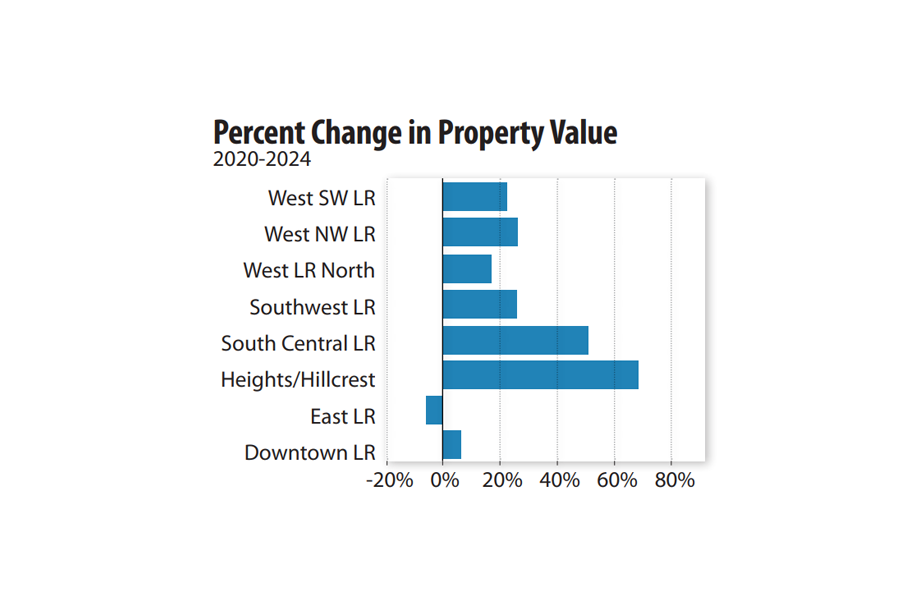 This chart, provided by Metroplan, shows the change in property value for areas within Little Rock from 2020 to 2024. The figures are in nominal dollars, without adjusting for inflation.