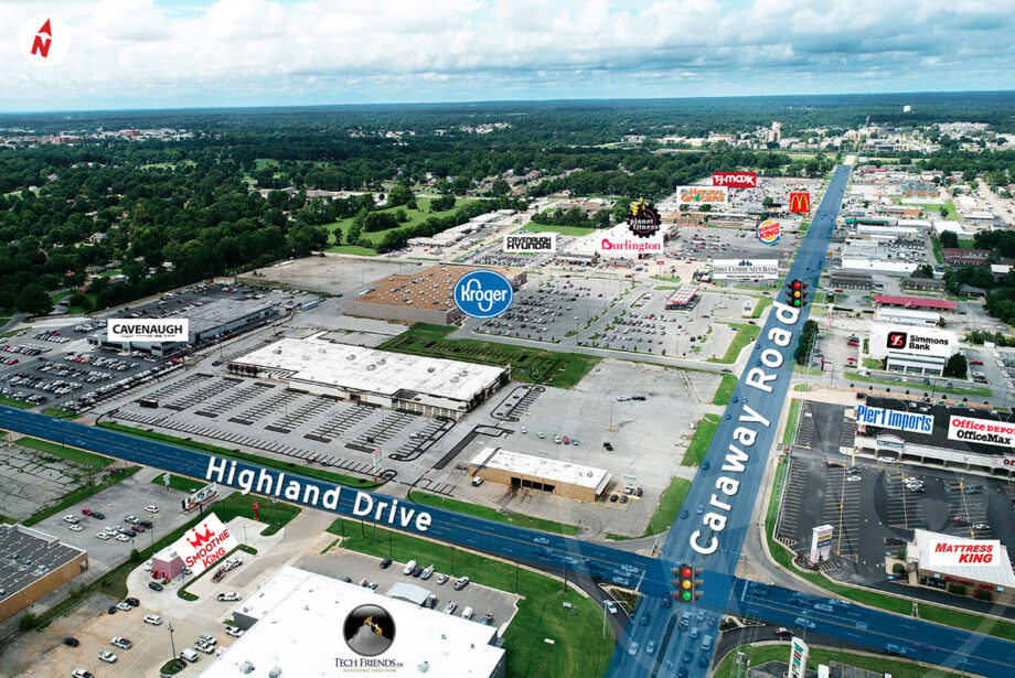 Anchored by the 125,000-SF Kroger Marketplace, opened in 2014 on the corner of Caraway and Wilkins Drive, the old mall project is on a 16.07-acre site that includes the 80,000-SF retail space that once housed Sears and 35,000-SF of retail space connecting Kroger Marketplace to the Sears building. There are four out-pads along Caraway and Highland and a large, mixed-use development behind Kroger.