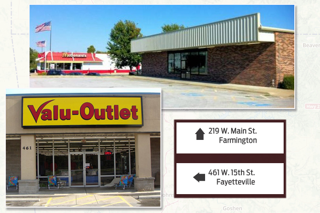 The Farmington property is used by an event center company, and the Fayetteville property is a Valu-Outlet store.