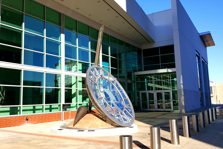 The sculpture features a large glass and metal compass with the Louisiana Purchase etched inside the continental U.S., with surveyors’ tools balanced against it.