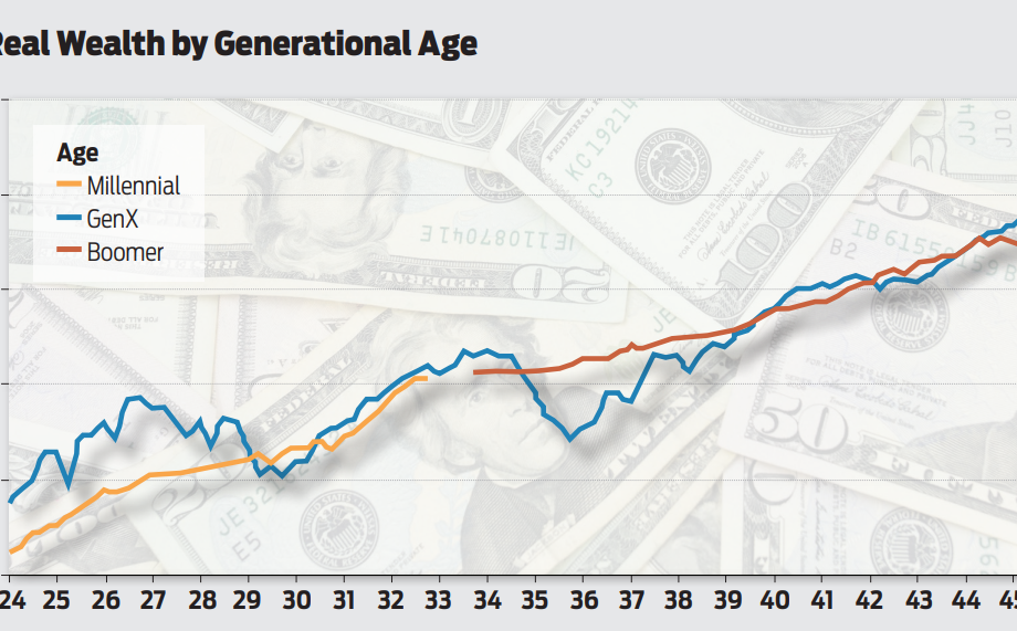 This chart, prepared by the Federal Reserve Bank of St. Louis, shows average real family wealth of three different generations during their young- to mid-adult years.