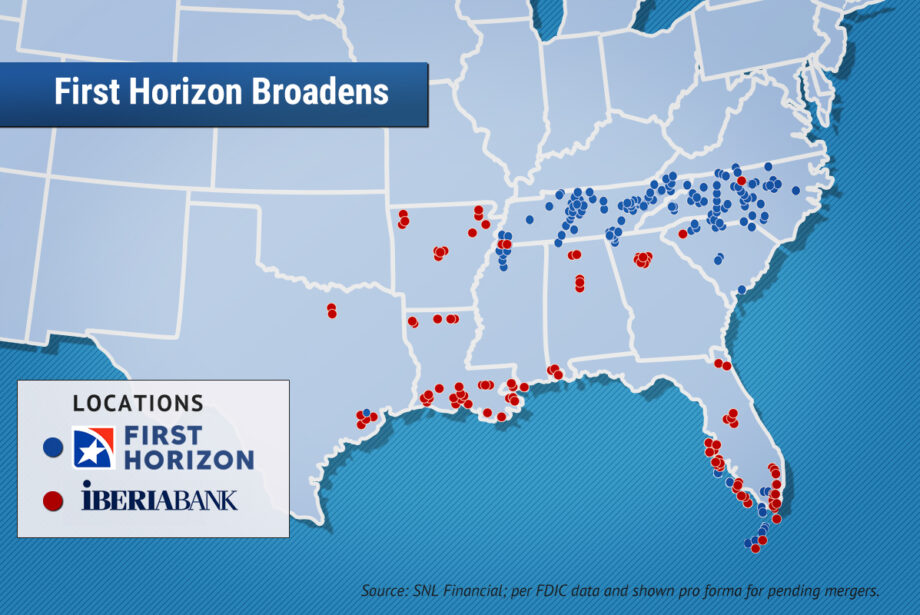 In the case of First Horizon Bank of Memphis and IberiaBank of Lafayette, Louisiana, you will get the 33rd-largest at $74 billion in total assets and the marriage of two 100-plus-year-old lenders.