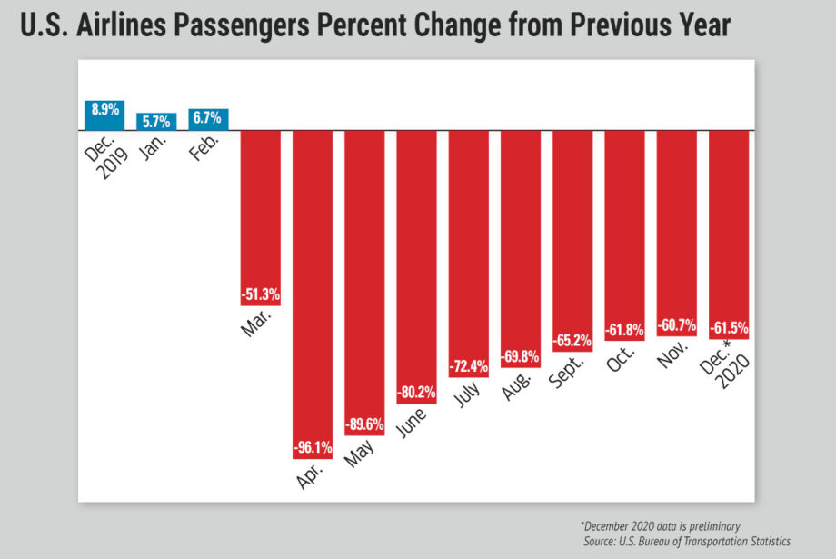 The COVID-19 pandemic hit the airline industry hard. U.S. airlines carried 557 million fewer passengers in 2020 than in 2019, a 60% decline.