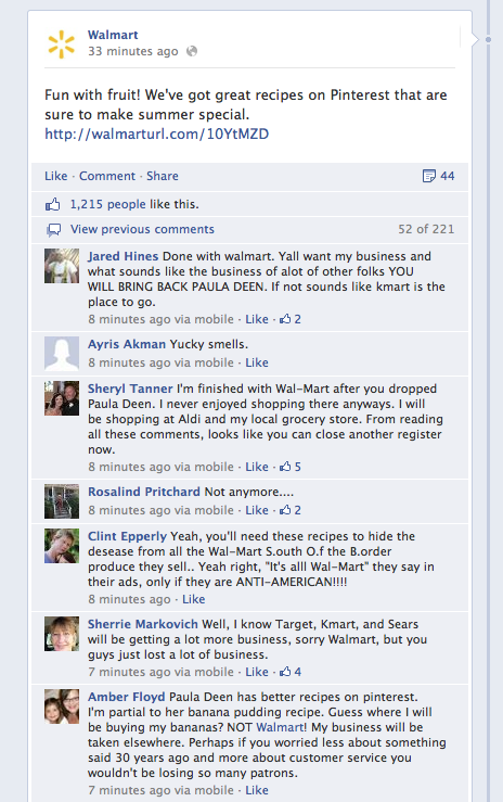 And Deen’s fans have been especially vocal on social media, including posts on Wal-Mart’s corporate Facebook page. You can see a sample of some of the recent posts below, and Business Insider has a bigger roundup of posts here.