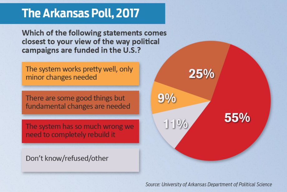 Most Arkansans believe that the system of funding political campaigns in the U.S. should be “completely rebuilt,” according to the 19th annual Arkansas Poll, conducted by the University of Arkansas and released Tuesday.