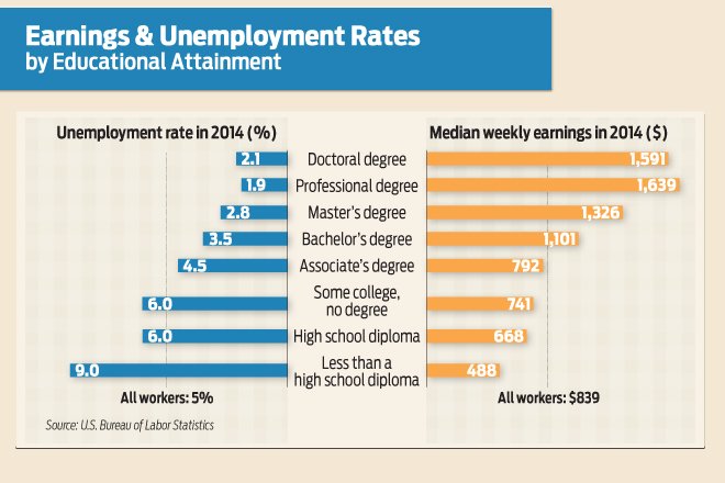 The education categories in the graphic reflect only the highest level of education attained. They don’t take into account completion of training programs in the form of apprenticeships and other on-the-job training, which may also influence earnings and unemployment rates.