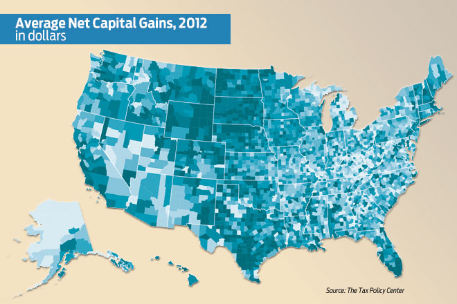 The map is based on a report released last month by the Tax Policy Center, a joint venture of the Urban Institute and the Brookings Institution. The report, “Net Capital Gains Across ZIP Codes” by Benjamin H. Harris and Lucie Parker, uses ZIP code-level data on taxes and demographics to examine net capital gains.